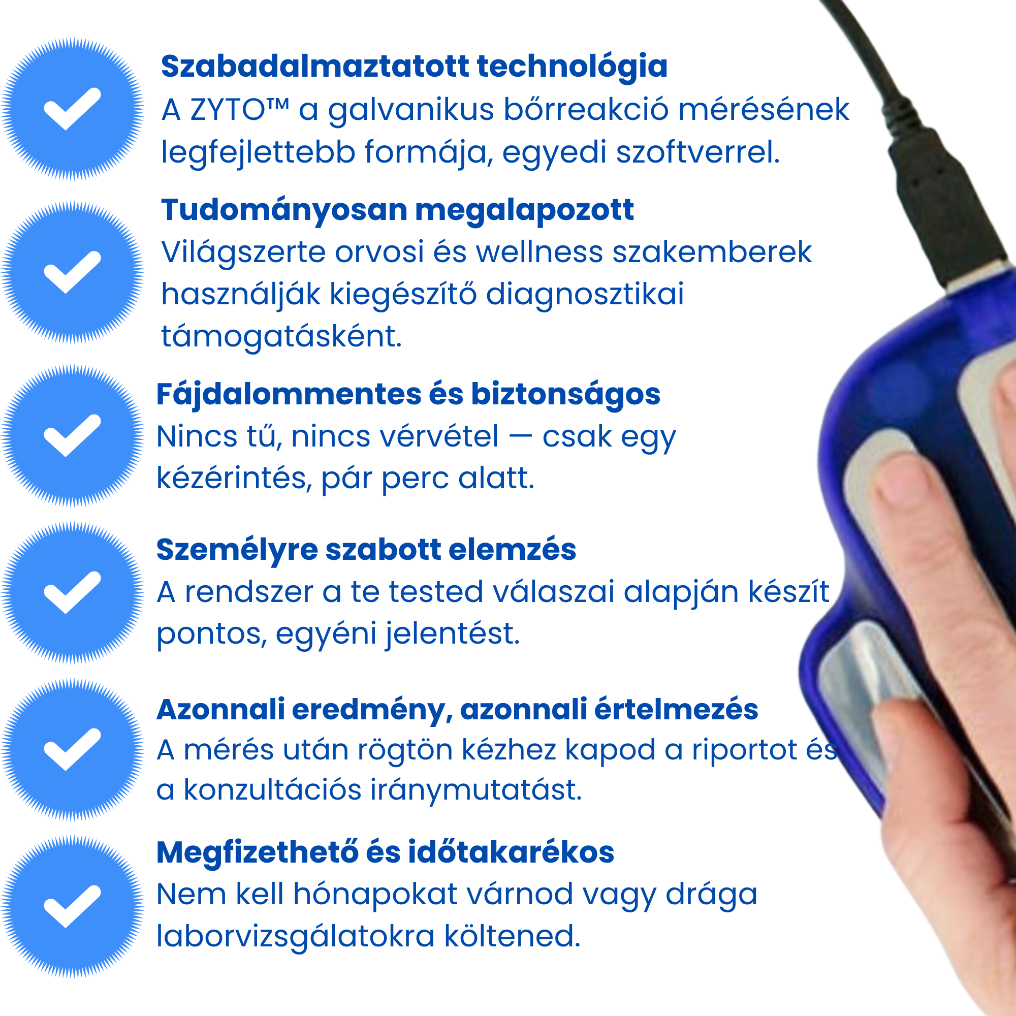 A ZYTO nem helyettesíti az orvosi vizsgálatot, de kiváló kiegészítője annak: segít megelőzni a problémákat és támogatni tested természetes egyensúlyát — egyszerűen, elérhetően, és gyorsan.